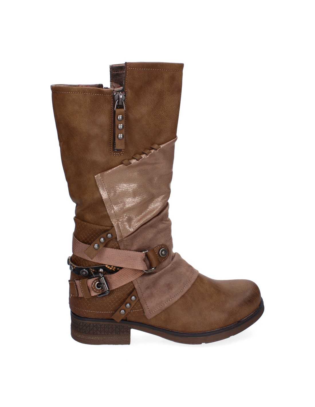 Botas com fechamento lateral em zíper e faixa decorativa de strass. Biqueira redonda e fivelas decorativas no tornozelo.