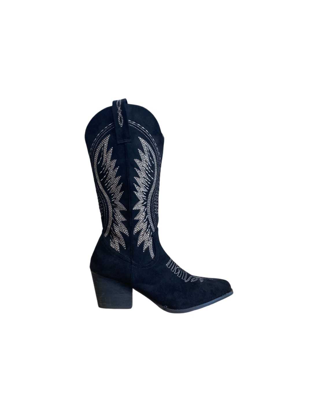 Botas country com bordado no cano e bico fino. Salto quadrado.