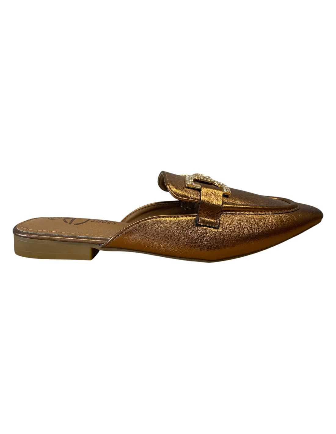 Tamanco de bico fino com decoração metálica no peito do pé.