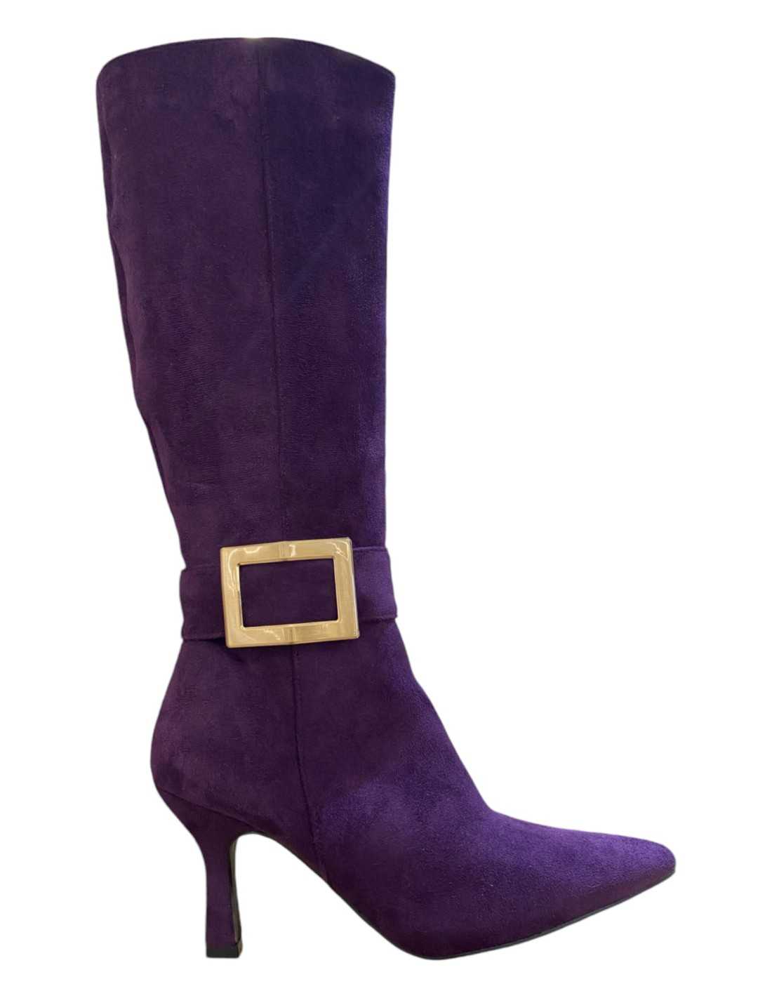 Botas de camurça com tornozeleira combinando, com fivela quadrada decorativa em ouro fosco. Calcanhar e bico fino.