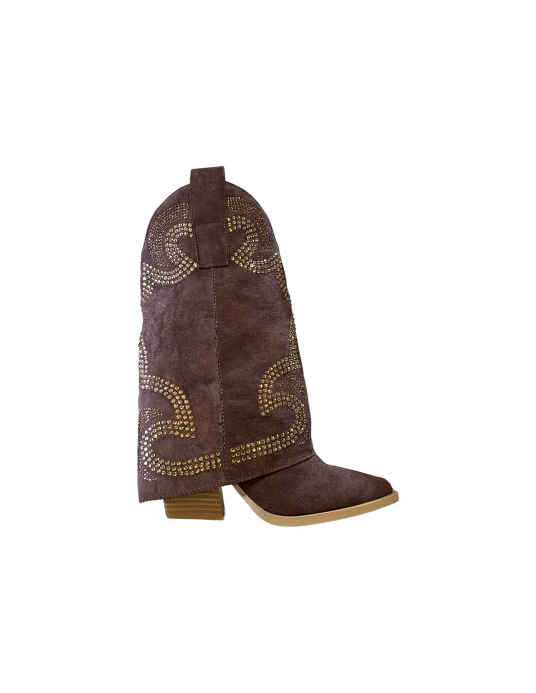 Botas de camurça com capas decoradas com strass. Biqueira fina e salto de madeira.