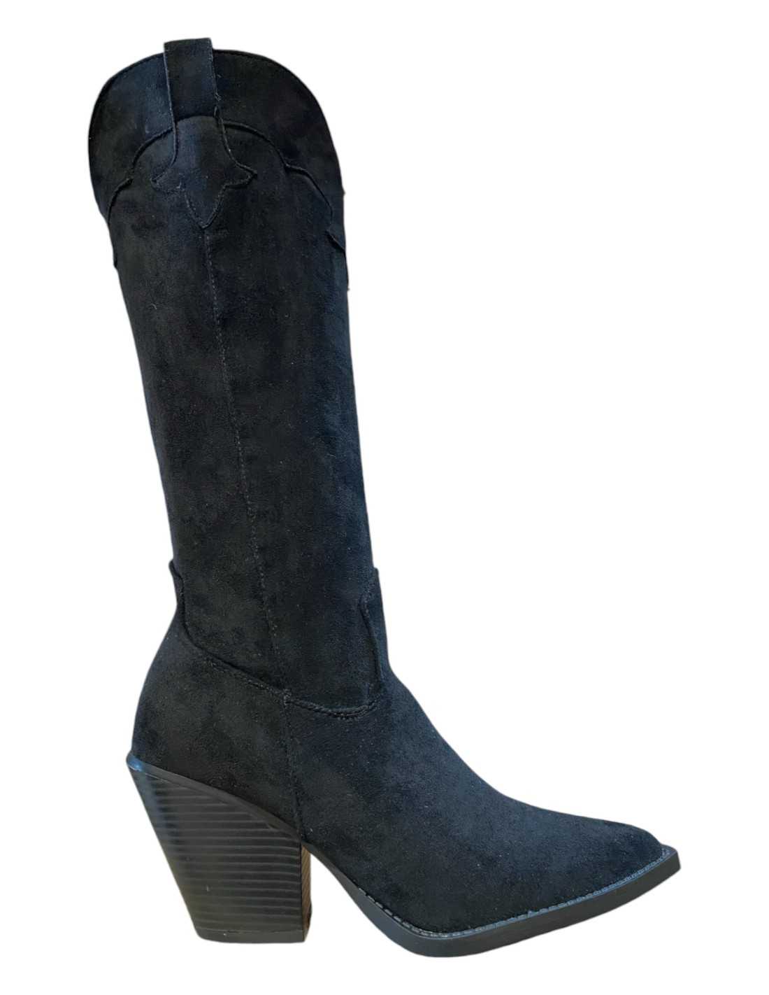 Botas de camurça com cano e salto altos, bico fino e fecho com zíper.
