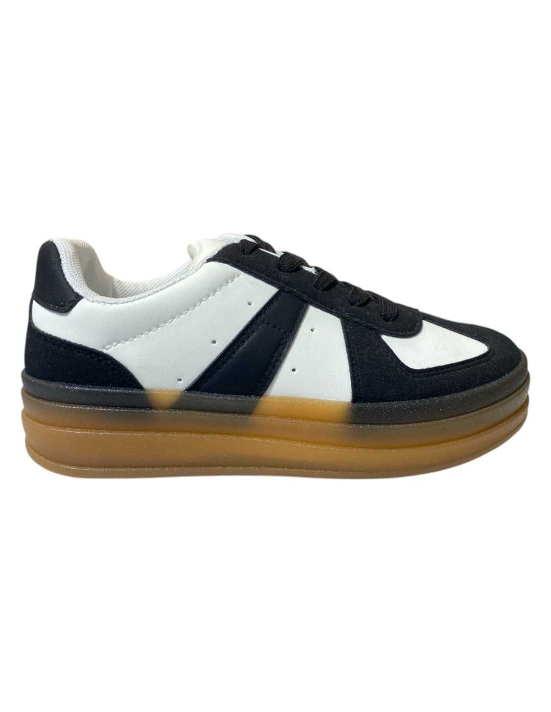 Tênis com plataforma dupla em crepe, combinando biqueira e salto com camurça.