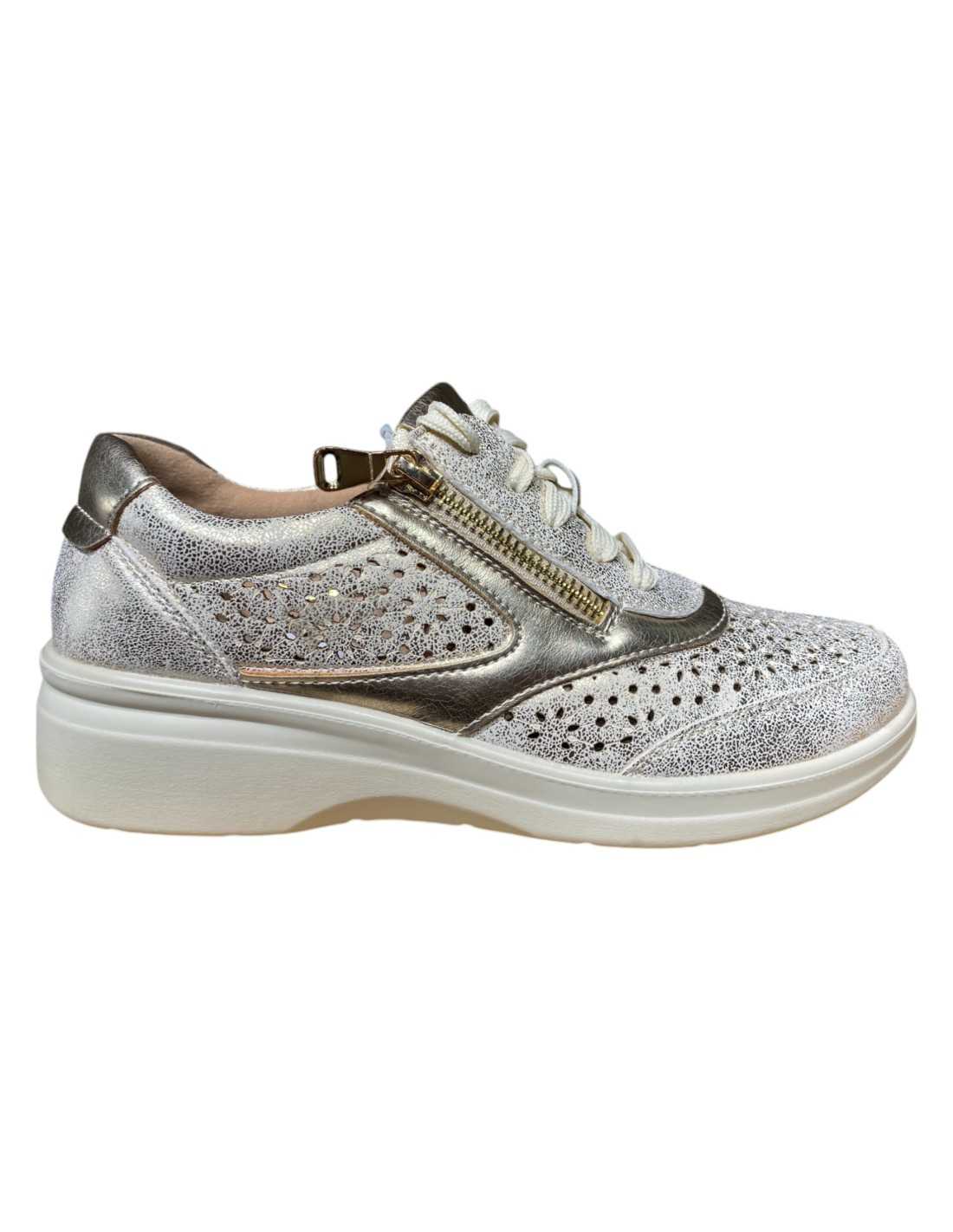 Tênis esportivo com fecho de zíper, solado alto e gáspea vazada. Calcanhar e laterais metálicos.