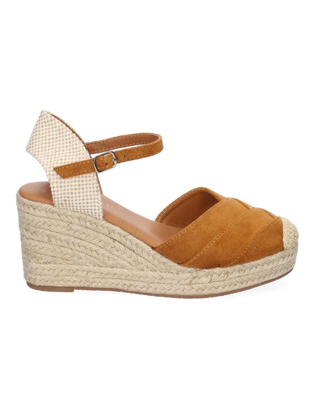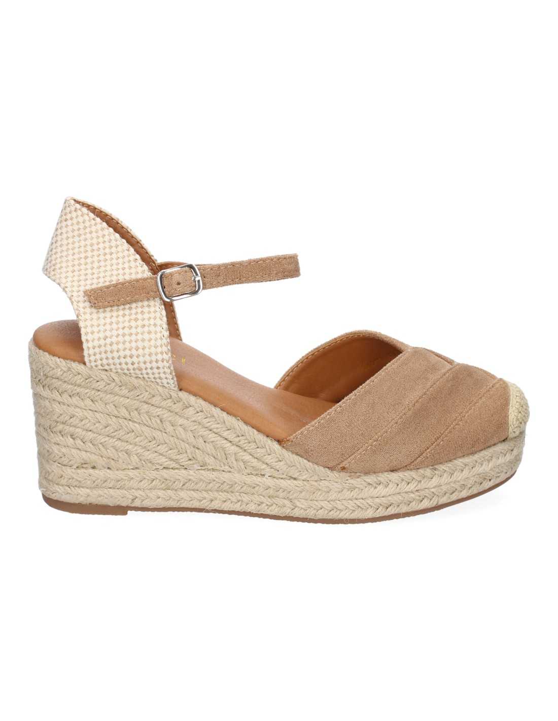 Calças estilo valenciano, cruzadas no peito do pé, confeccionadas em camurça com bico de crochê, costas nuas e fecho de fivela no tornozelo.