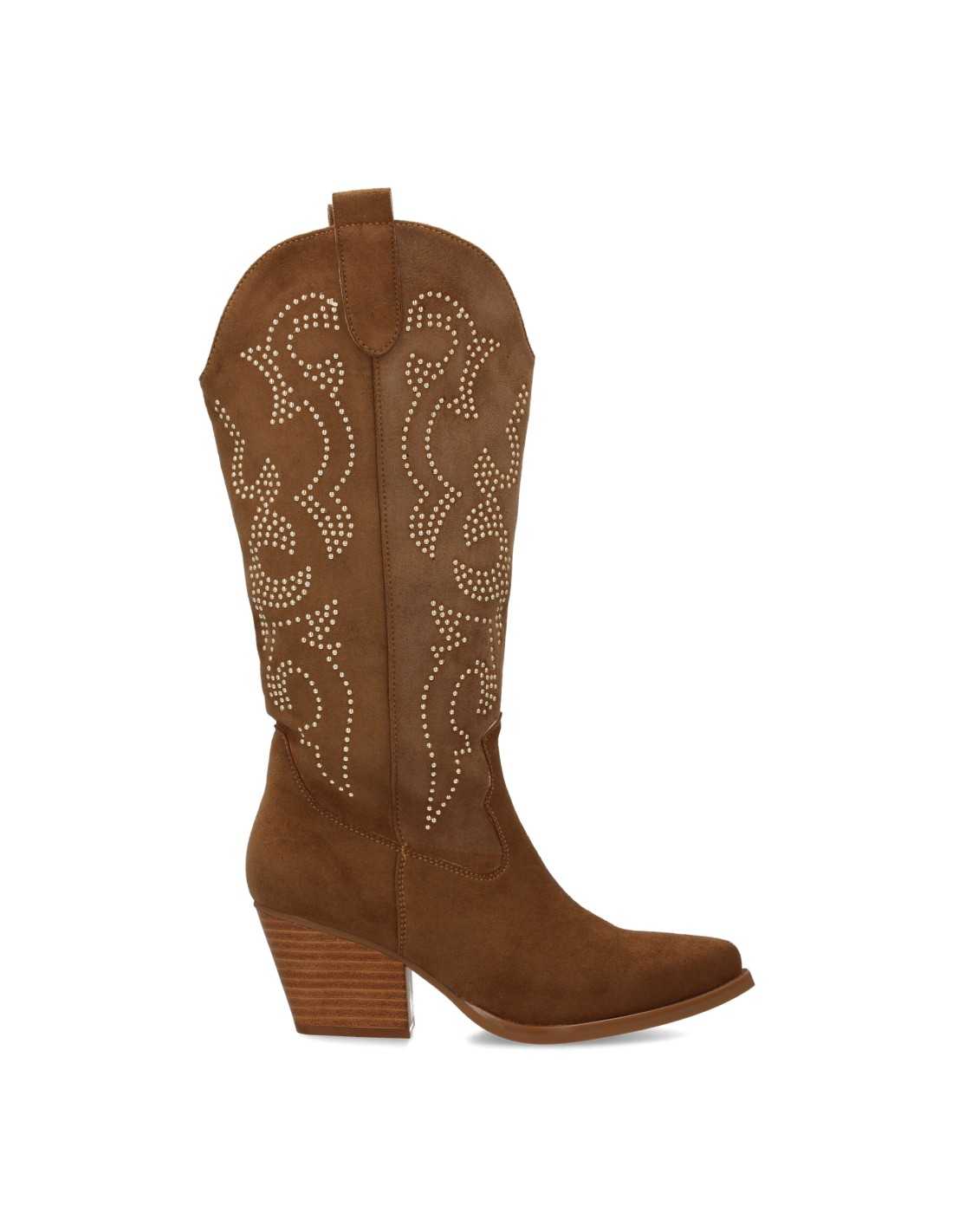 Botas de camurça até o cano médio com tachas e fecho de zíper. Salto cubano.