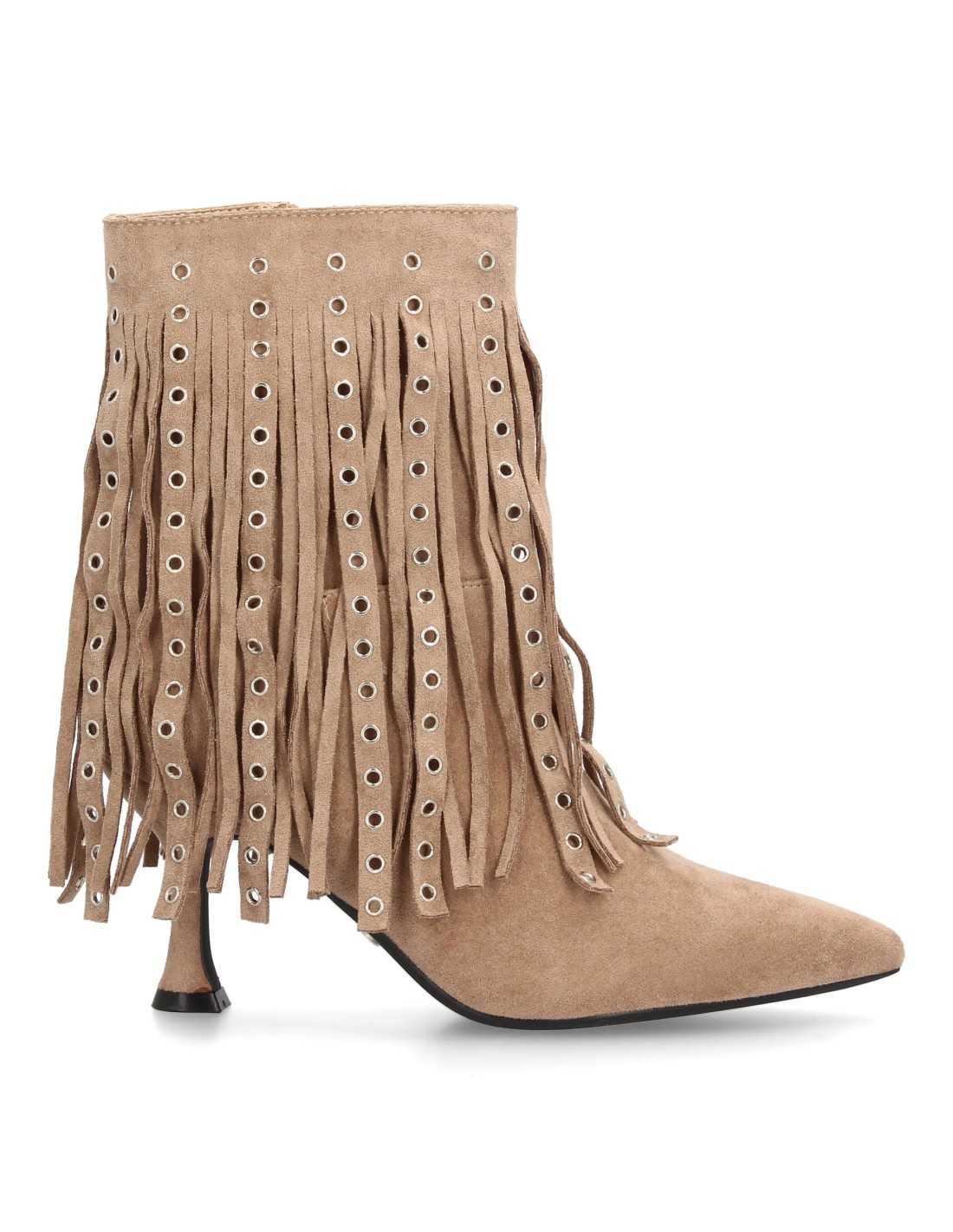 Botins femininos com design de cano alto, adornados com franjas longas e ilhós de metal. Bico fino e salto fino.