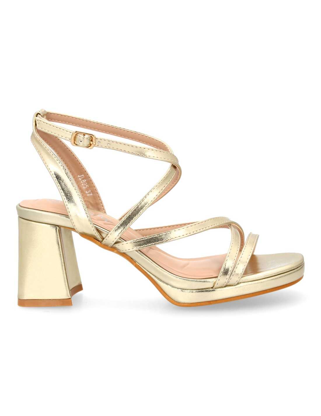 Sandália de salto com tiras finas, planas e cruzadas. Salto largo e plataforma frontal para maior estabilidade. Com fecho de fivela.