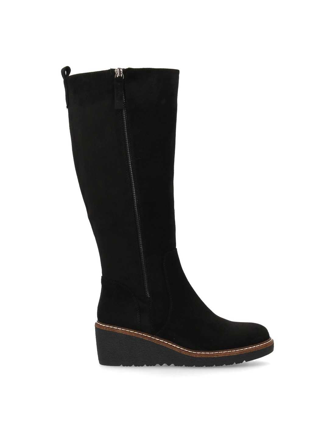 Bota de cano alto em camurça com design elegante. Possui salto largo e solado com travas. Fechamento interno por zíper, ideal para o outono/inverno.