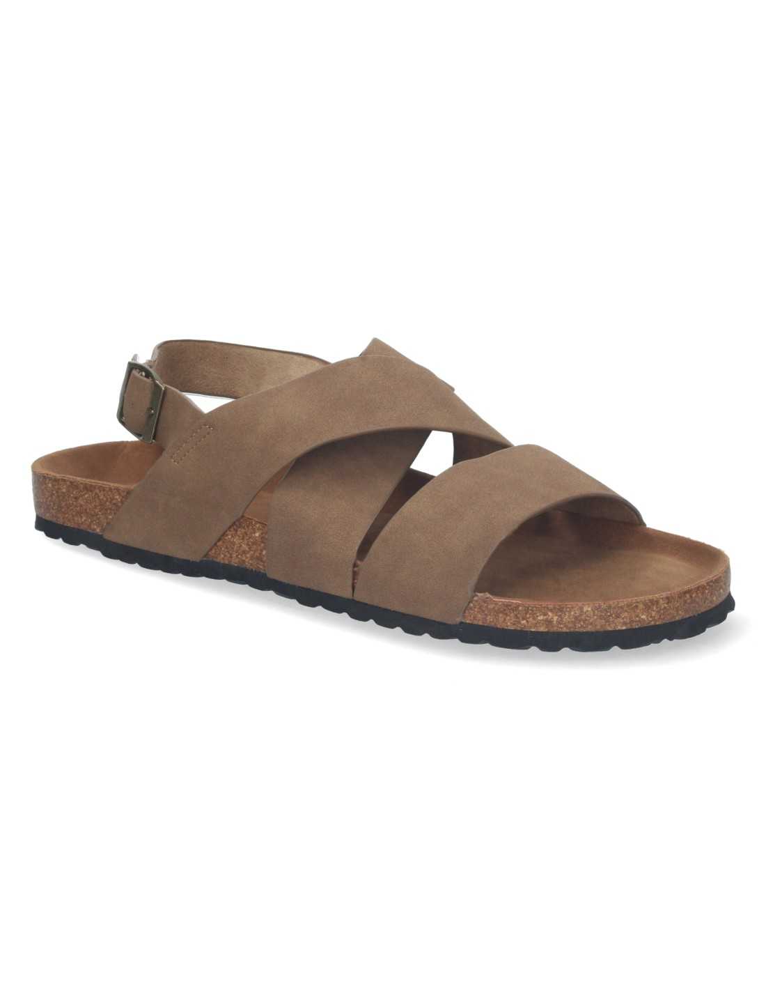 Sandália de homem com fecho de fivela traseira e cruzamento na parte superior do peito do pé.